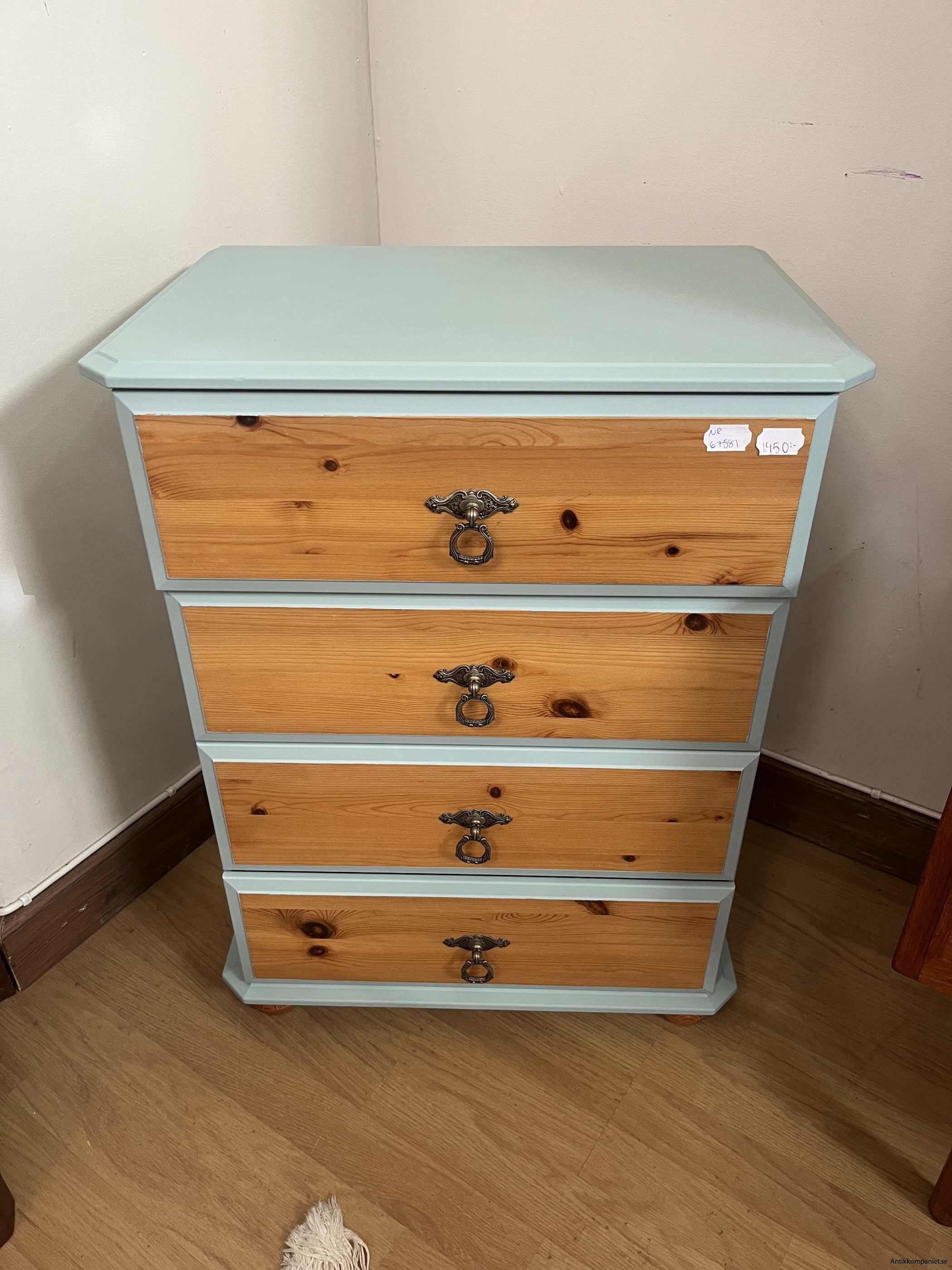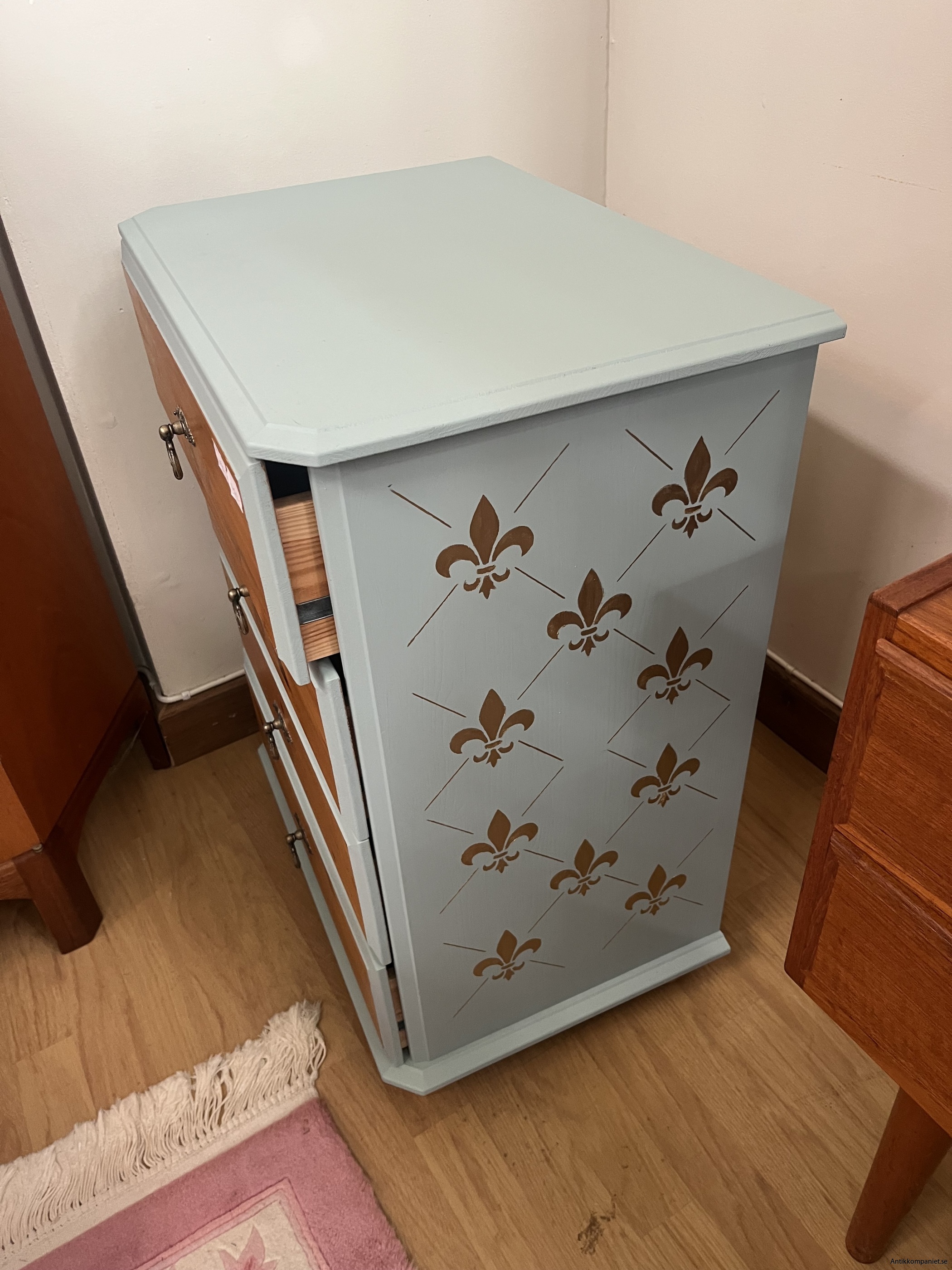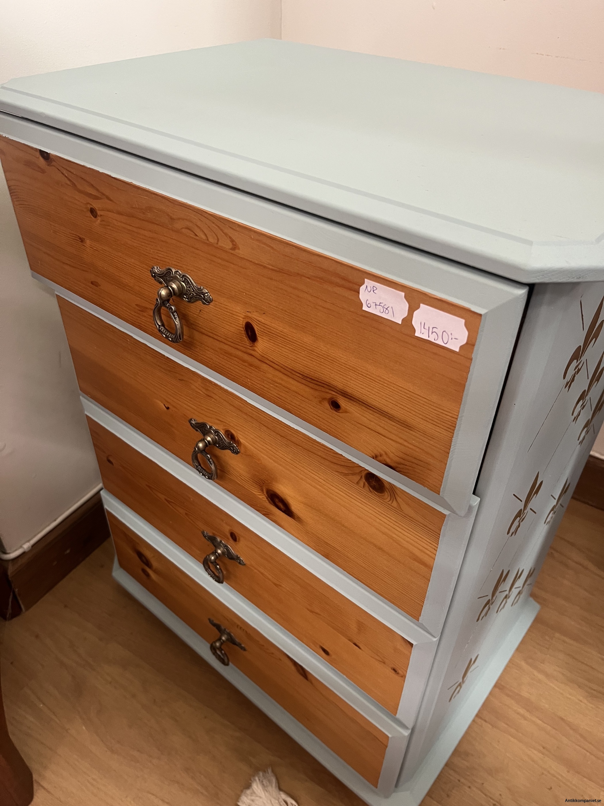 furu byrå, målad i ljusblå med franska liljan